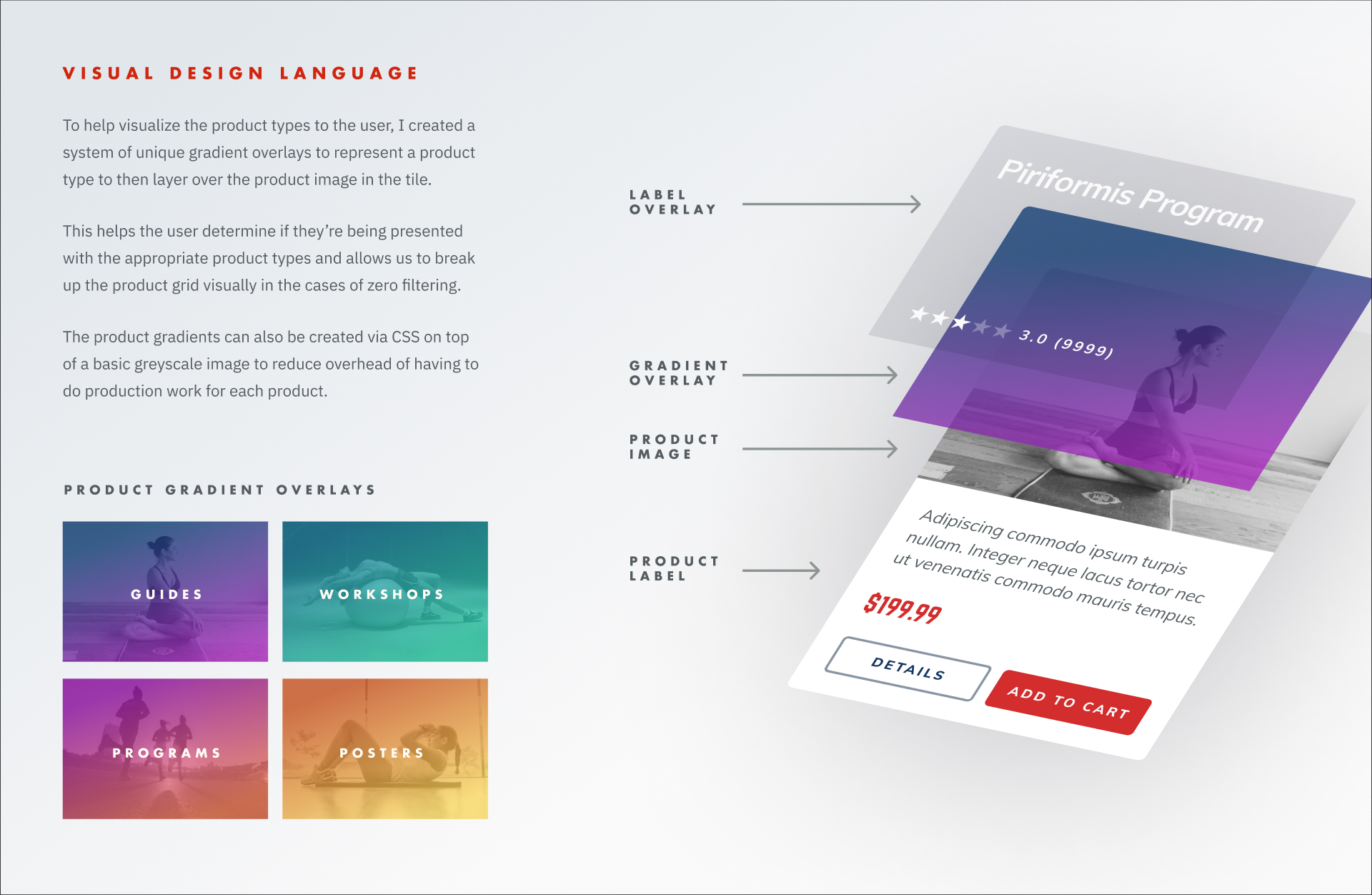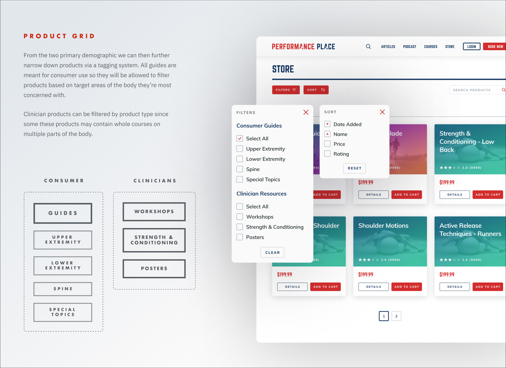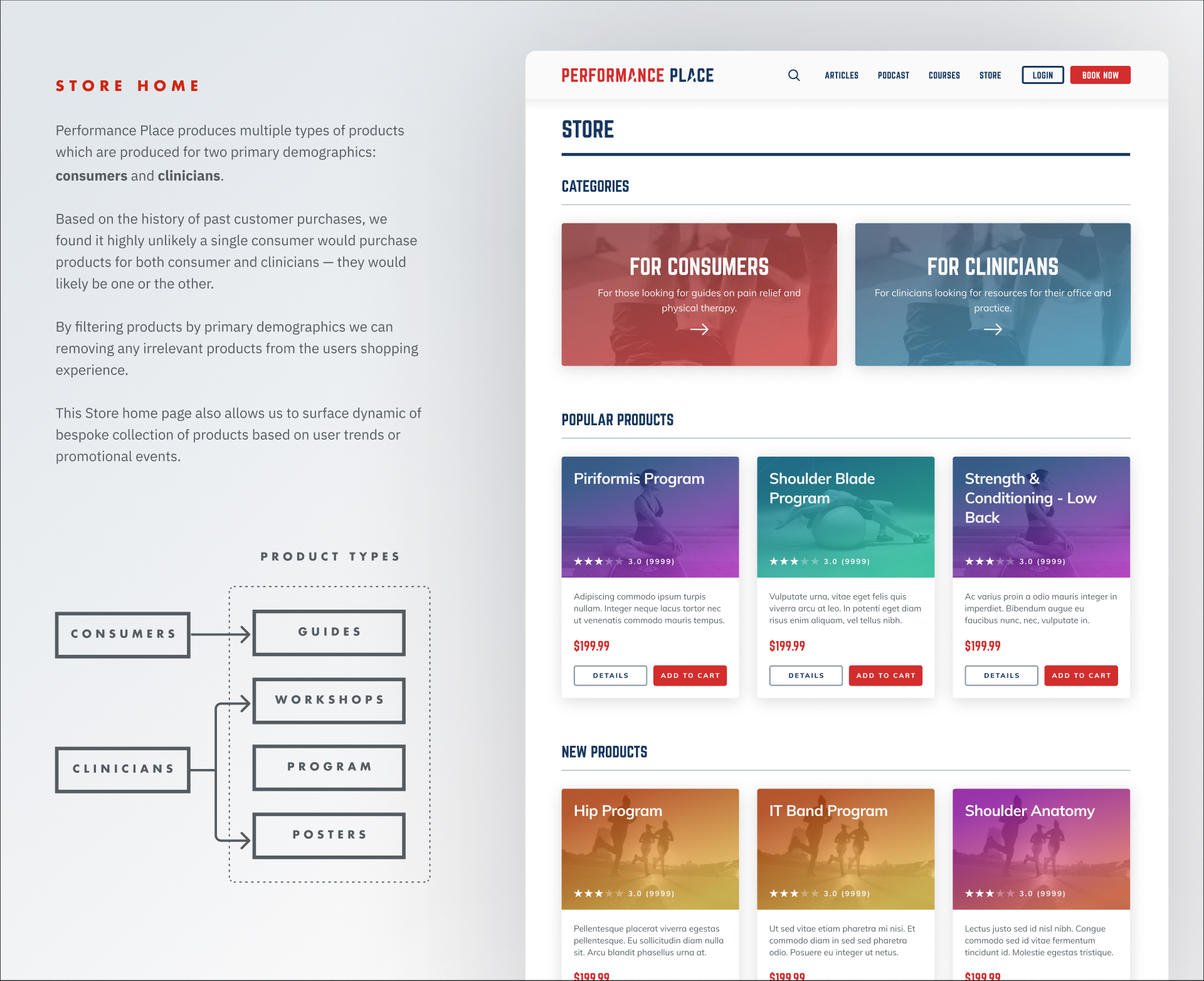 The previous store page was a flat hierarchy, composing of multiple kinds of products aimed at two different customers. I was tasked to address the hierarchy issue as well as help focus the user on products that were more relevant for them.