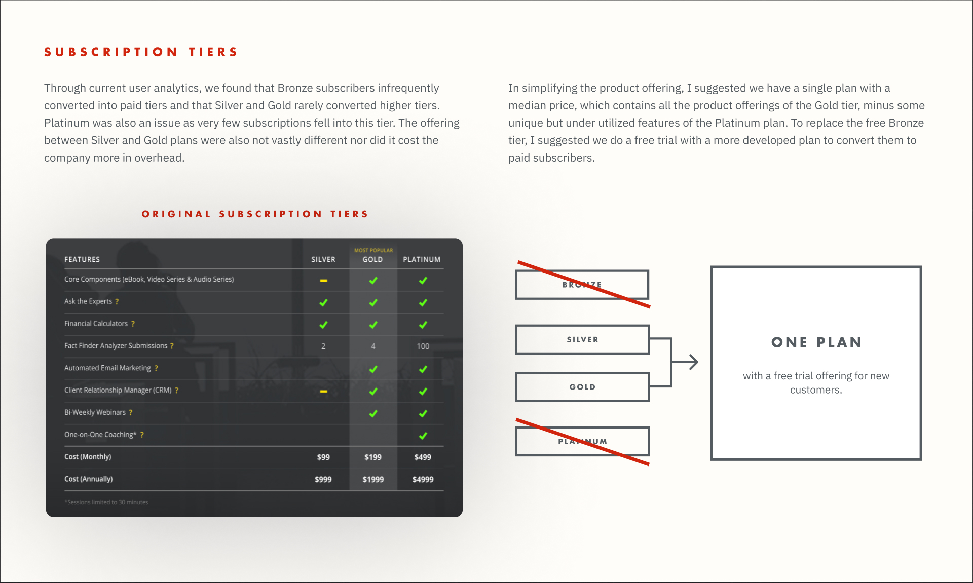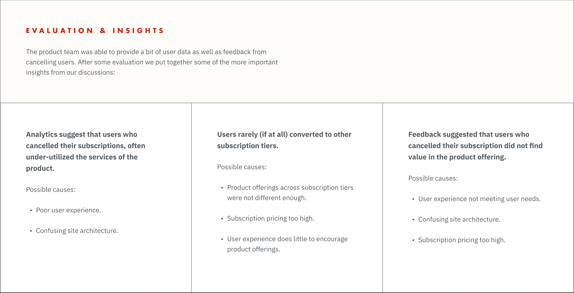 Although the service has a modest amount of subscribers generating decent income, the product team concerns were two fold: First, subscription numbers were stagnant it seemed users were cancelling subscriptions as fast as they were gained. Second, feedback from cancelling users implied they did not find value in their subscription.